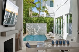 Outdoor living centers around a private courtyard featuring a heated saltwater plunge pool, an air-conditioned and heated lanai with outdoor kitchen, and a second gas fireplace that enhances the year-round outdoor living experience. The detached cabana suite, complete with full bath and private sliders, functions seamlessly as a guest residence, office, fitness studio, or fourth bedroom.